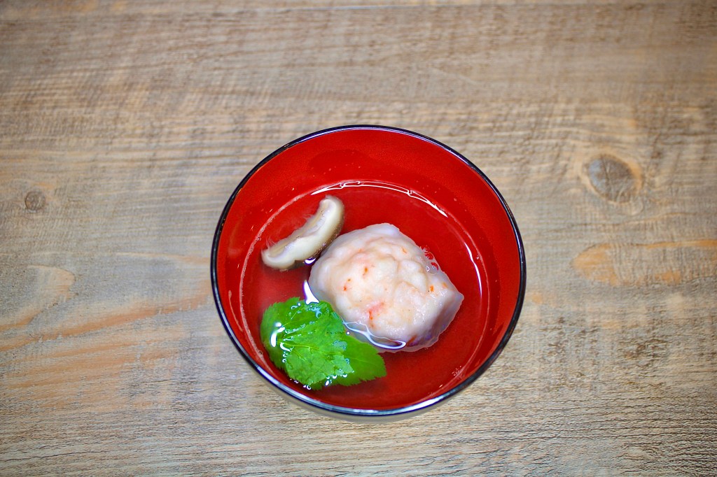 Today I prepared a shrimp dumpling (ebi-shinjo) in a clear dashi soup. It was topped with shiitake and mitsuba. It only took about 30 minutes to prepare and was quite delicious.