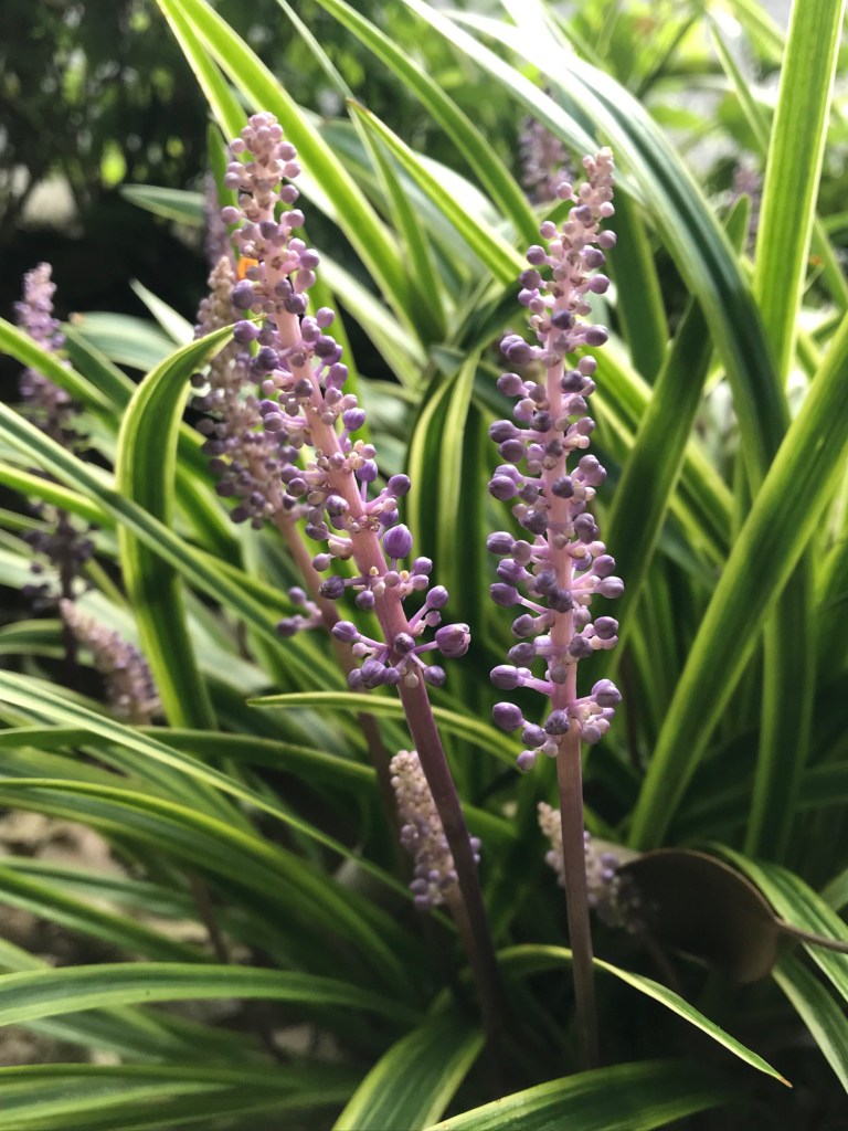 最近、気がつくと道端でよく見かけるので、調べてみるとヤブランと言うそうです。今、ちょうど紫の花?みたいなものが沢山見えます。