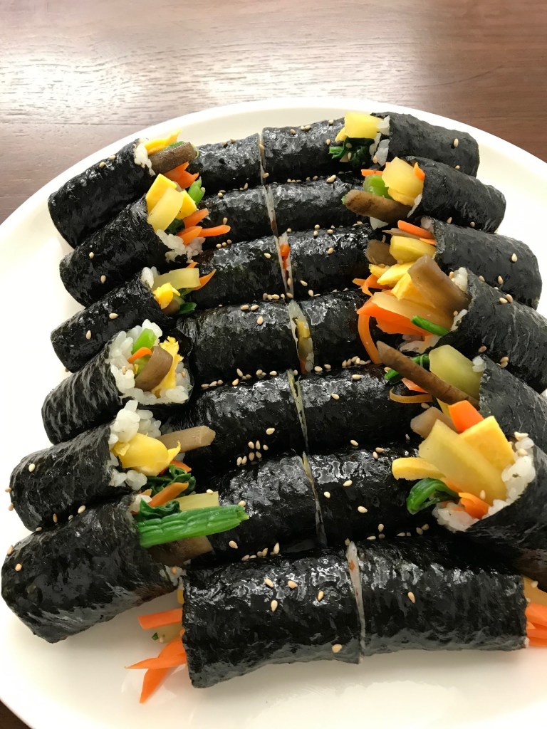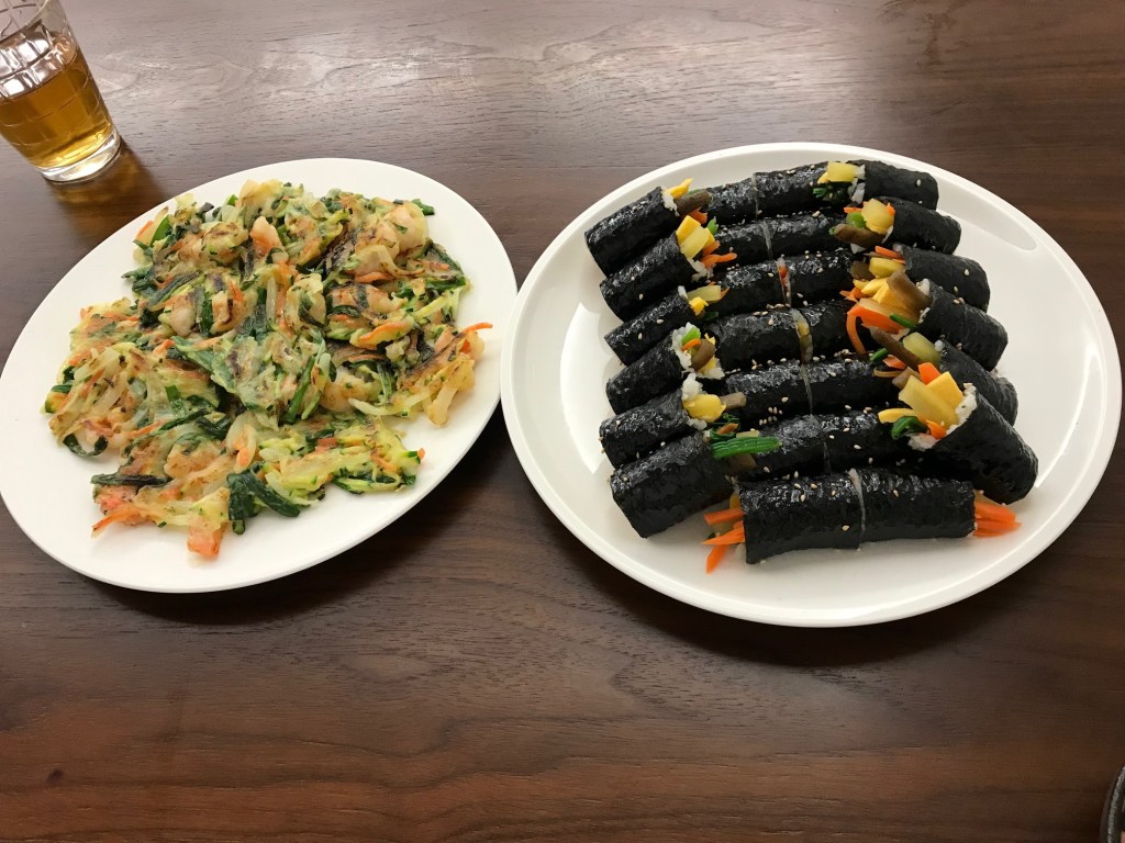 韓国の海苔巻き(キンパ) と海鮮チヂミ。