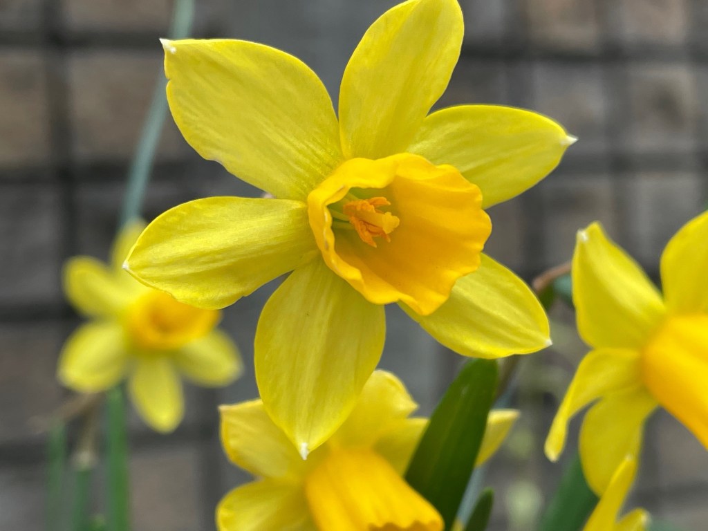 A number of narcissus’s are showing their faces in the flower beds. They are blooming prettily in vivid spring colors.